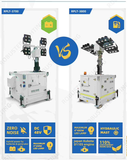 The RPLT-3700 and RPLT-3800 are advanced hybrid hydraulic light towers engineered for reliable, high-performance illumination in demanding environments. Powered by a proven Kubota diesel engine with hybrid battery support, they deliver efficient, low-noise operation and long runtime. Featuring a hydraulic mast, powerful LED lamps, robust enclosure, and easy transport design, these light towers are ideal for construction sites, mining, events, and emergency applications where durability, efficiency, and consistent lighting are essential.